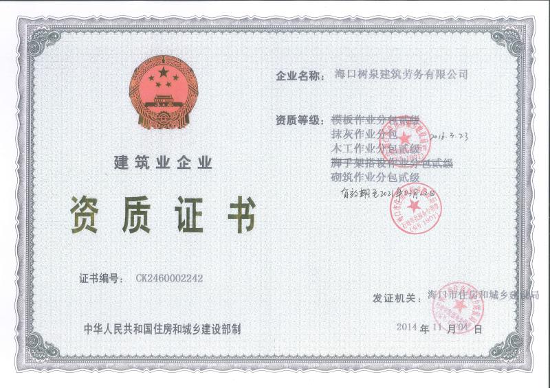 海口樹泉建筑勞務有限公司成立于2011年,公司位于???,其前身是一家專業建筑施工隊,自2004年即開始在海南從事建筑勞務施工。自成立至今,公司已經擁有一支科學管理、質量過硬、能打硬仗,搶工期的專業隊伍。能獨立承擔大中型工業與民用建筑 、室內外裝修、各類機電設備安裝工程。代表工程有??跒I海華庭、三亞時代海岸T01/02/04/05棟高層、合肥東海花園二期、陵水富力灣B區高層、三亞金中海(酒店)、瓊海大印經典花園、海口環球海景大酒店(四星級酒店,在建中)、陵水珍珠大廈(五星酒店)、??谌f達廣場、美蘭機場二期。